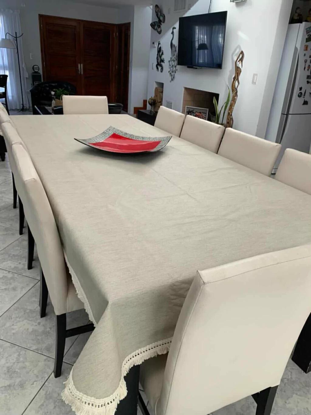 Todas las telas impermeables tienen 1,4 de ancho. Los manteles que superen esa medida llevan agregados en ambos laterales de la misma tela.