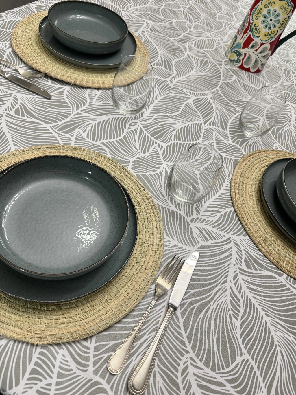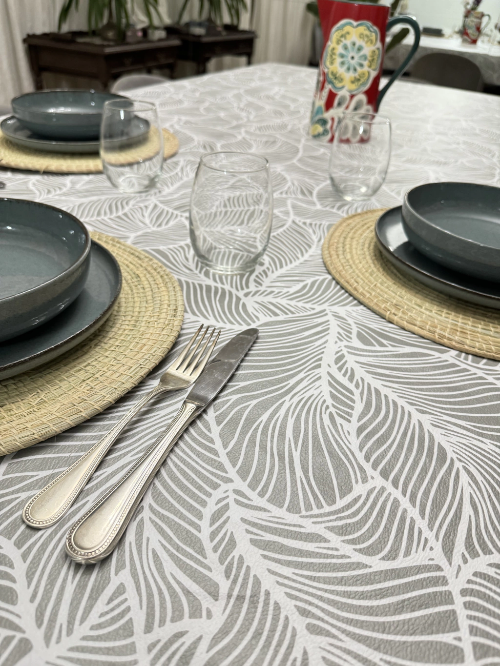Mantel de ecocuer simil lino color gris hojas blancas