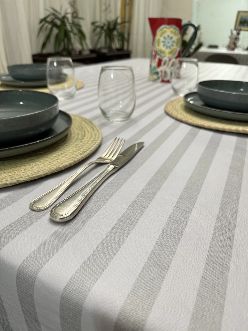 Todas las telas impermeables tienen 1,4 de ancho. Los manteles que superen esa medida llevan agregados en ambos laterales de la misma tela.