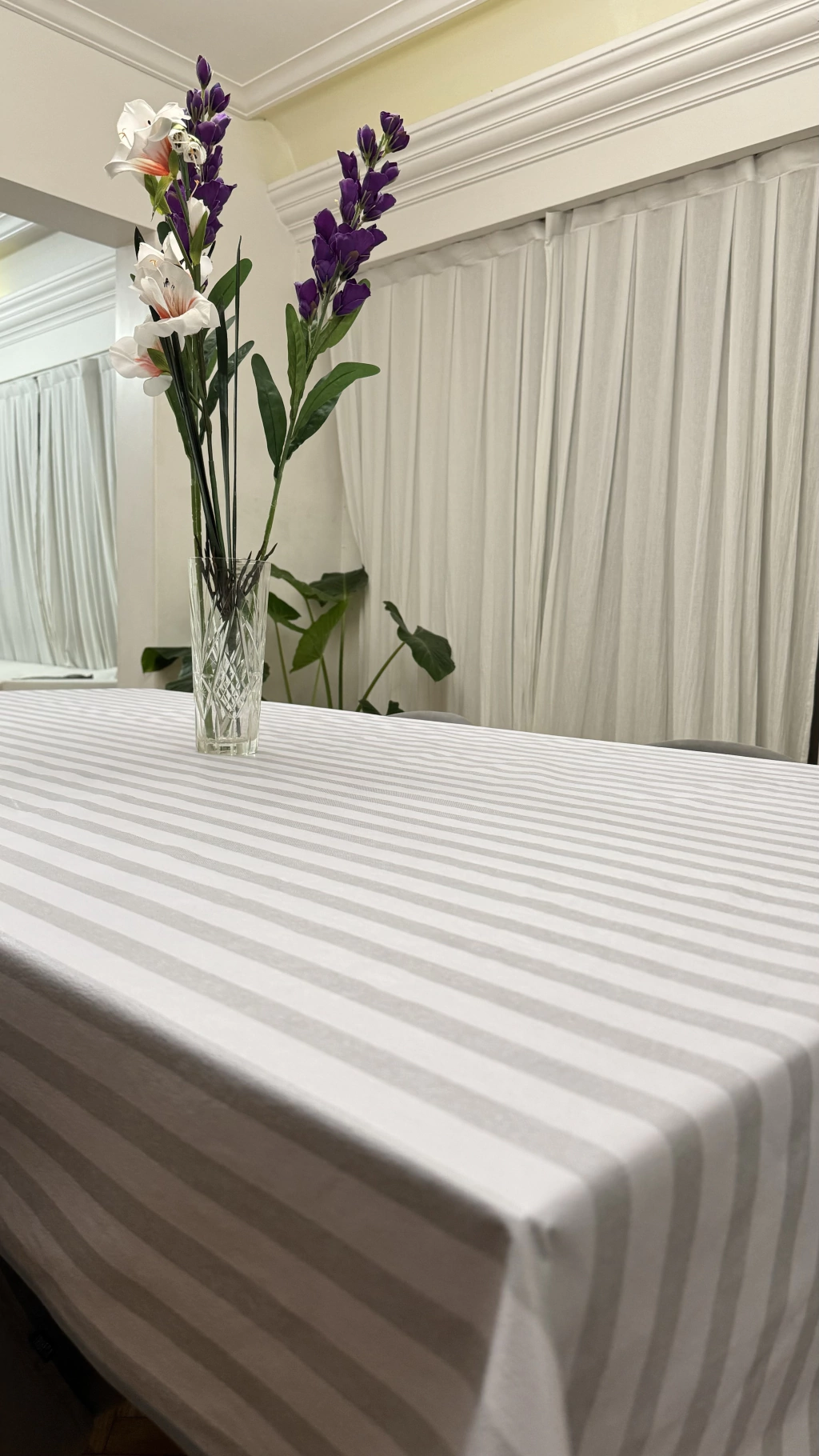 Mantel de ecocuer simil lino color rayas grises.